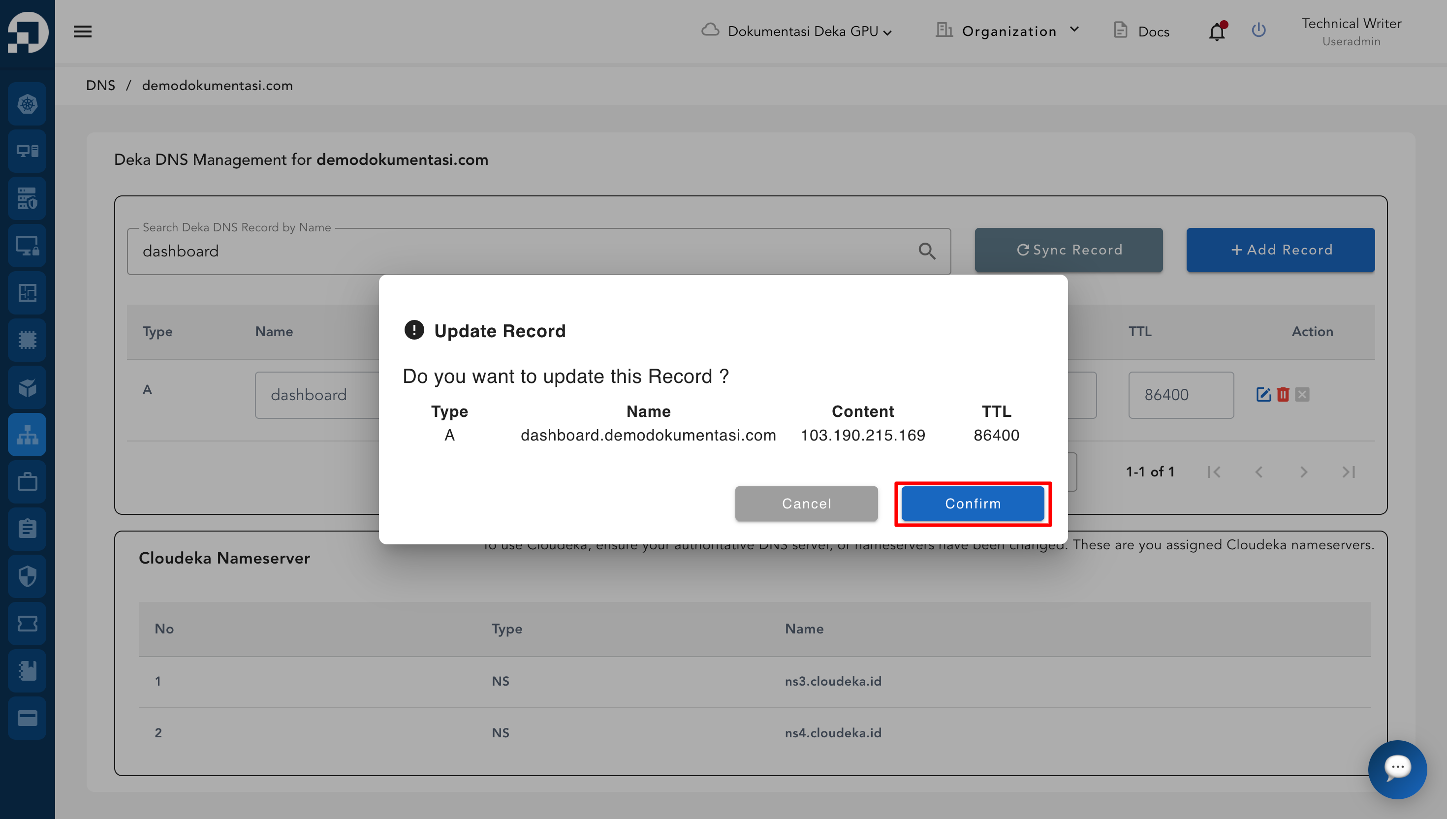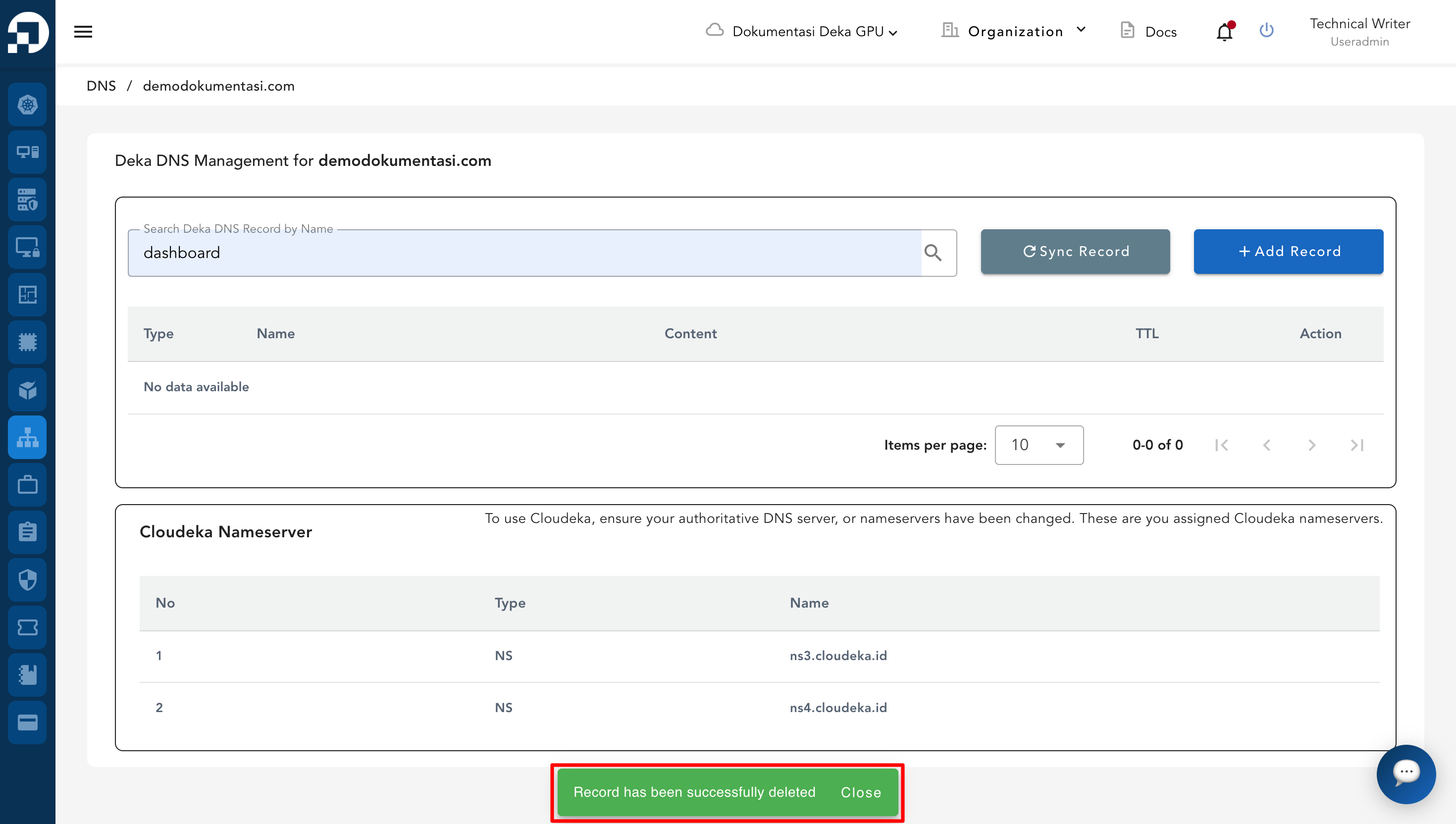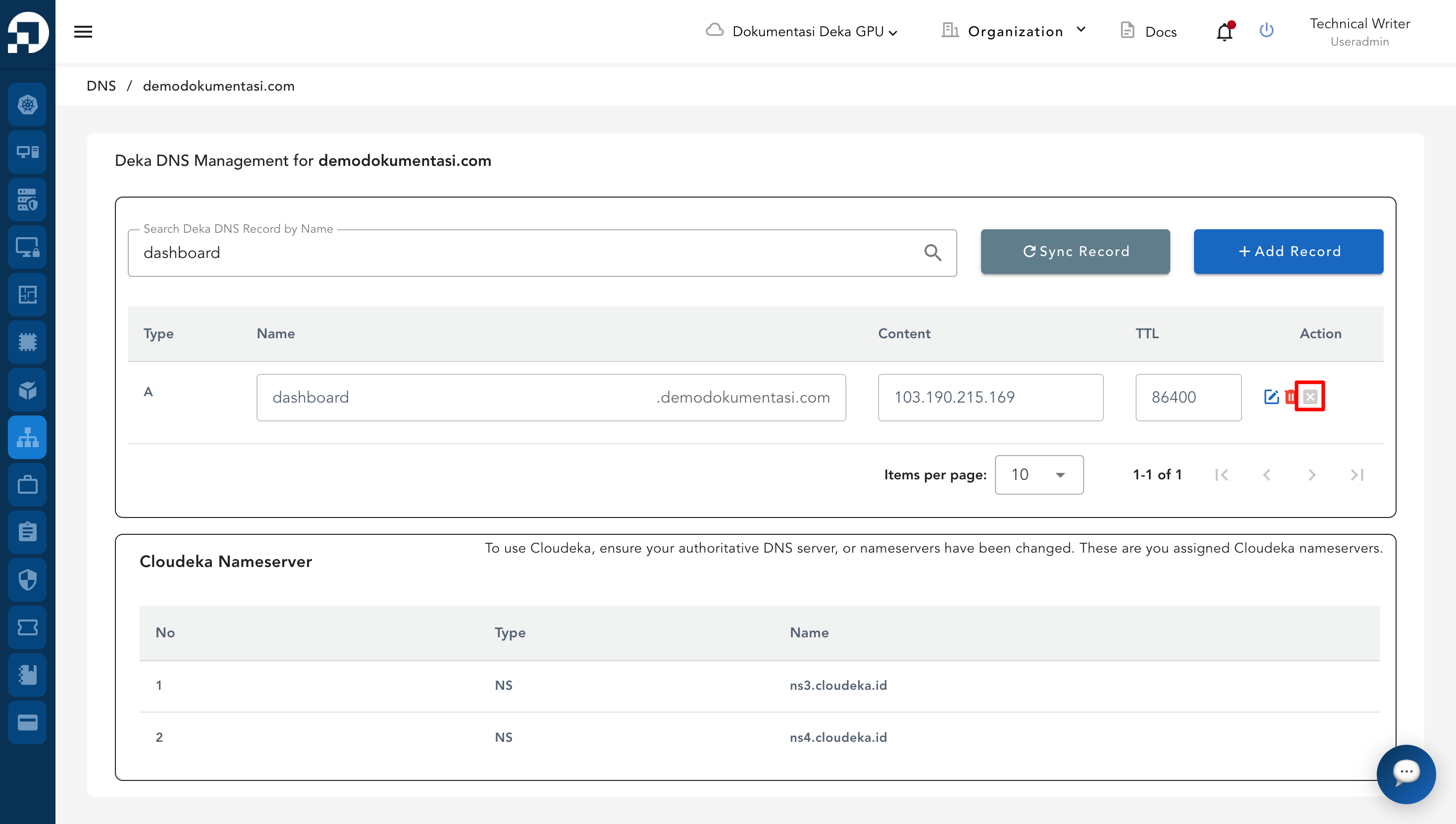 The Clouddeka Nameserver section shows the list of nameservers assigned by Clouddeka. To use Clouddeka DNS Management, ensure that the domain is configured to use these nameservers at the domain registrar.