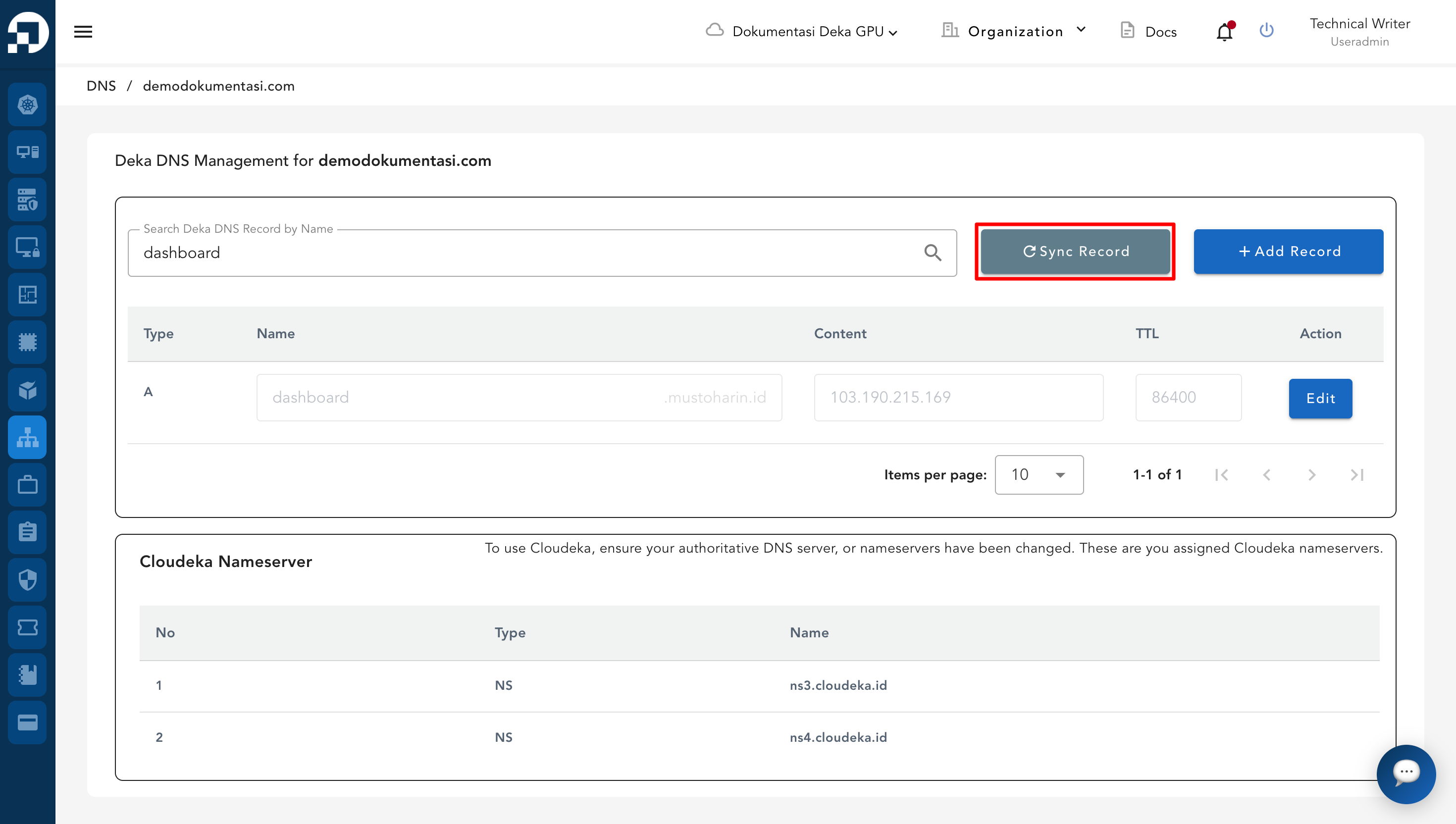 On the DNS Management page, the **Sync Record** button is available to synchronize the existing DNS records. After clicking the **Sync Record** button, the system starts the DNS record synchronization process.