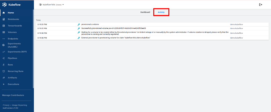 This menu is a section that allows you to monitor activities that occur in the Deka MLOps environment. The following is an example of what will appear in the Activity Menu when successfully creating a Volume in the "Volumes" menu bar.