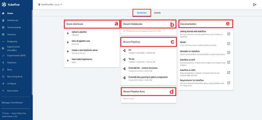 This section lists important features in Kubeflow that can be accessed quickly to make it easier for you to open various tools and services without having to navigate through deeper menus.