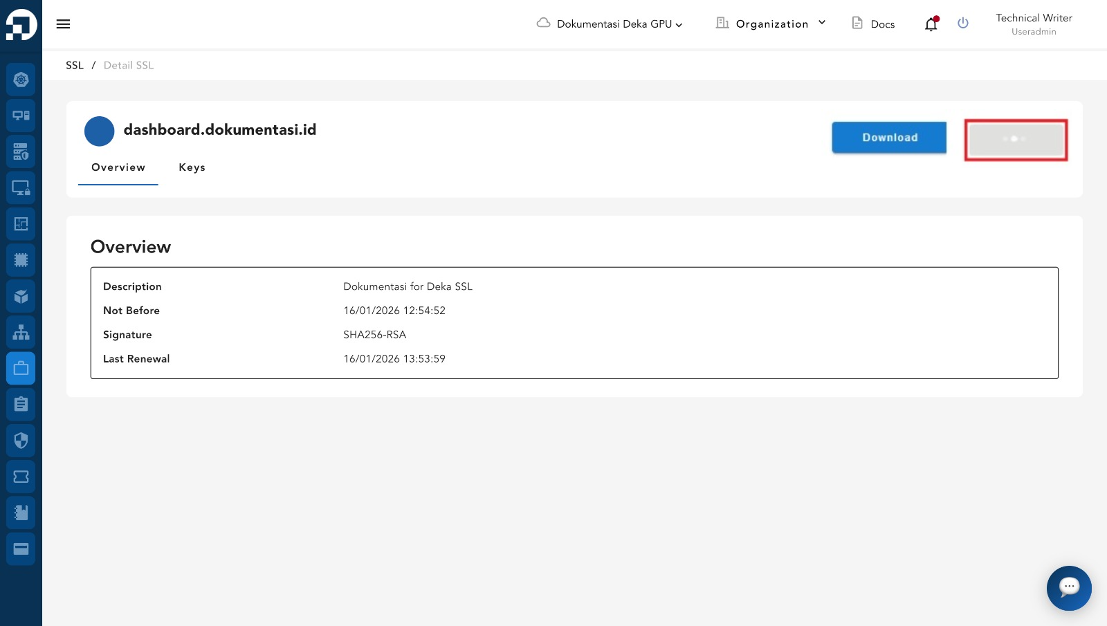 This section describes how to renew an existing Deka SSL. On the SSL page, select the SSL that was previously created.