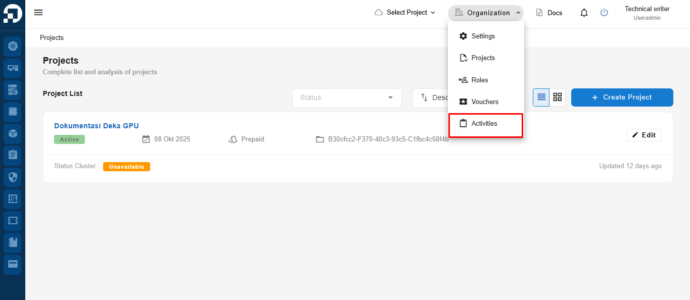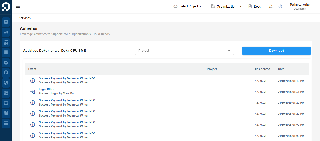 This menu is used to view all events, actions and changes that occur in your organization in the Service Portal Cloudeka. On the Deka GPU page in the Service Portal Cloudeka, select the Organization menu and then select the Activities menu.